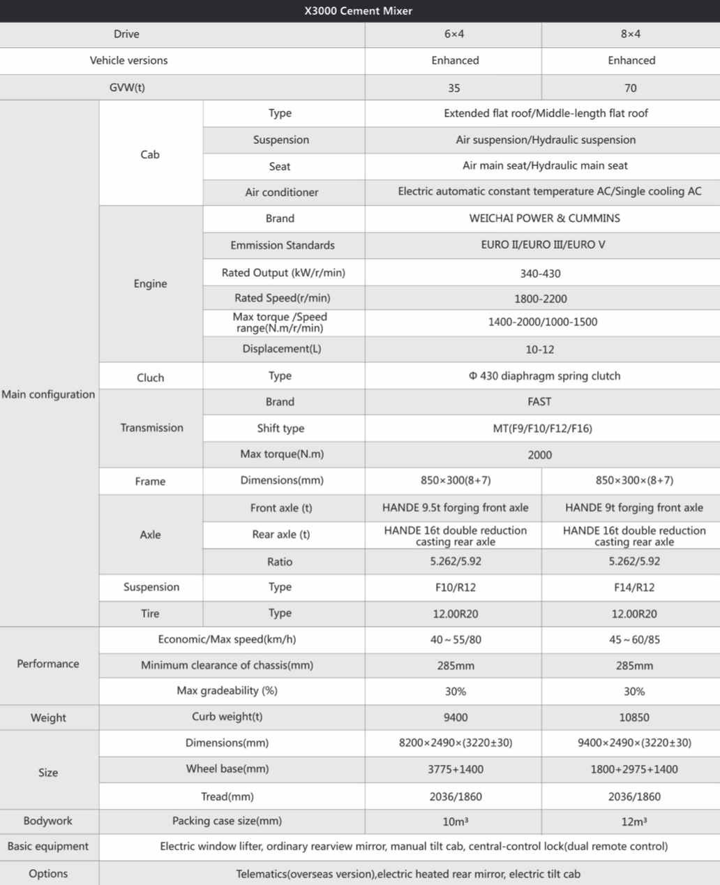 این شاسی مجهز به موتورهای Wuxi Chaiwei WP10/WP12 است که حداکثر توان آن از 350 تا 460 اسب بخار است. این مرکز با محور انتقال 12 سرعته FATAI و Hande Man ، مناسب برای شرایط پیچیده سایت ساخت و ساز مطابقت دارد. کابین یک طرح تعلیق چهار امتیازی را اتخاذ می کند و مجهز به صندلی های جذب شوک در کیسه هوا است و باعث افزایش چشمگیر راحتی راننده می شود. سطح مخزن تحت درمان با ماسهبازی ضد خوردگی قرار می گیرد و می توان یک سیستم اسپری اختیاری را برای جلوگیری از چسبندگی بتن نصب کرد. دفع تخلیه عقب می تواند 270 درجه بچرخد ، و اهرم عملیاتی به صورت مرکزی در سمت راست وسیله نقلیه مرتب شده و کنترل دقیق تک نفره را تسهیل می کند. کل وسیله نقلیه مطابق با استانداردهای ملی انتشار VI است و یک راه حل حمل و نقل بتونی کارآمد و سازگار با محیط زیست برای پروژه های ساختمانی شهری است.